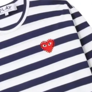 The CDG PLAY Metalstone Heart Striped L/S Tee (Navy/White) is a true statement piece that blends playful design with timeless