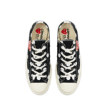 Crafted with durable canvas uppers and finished with the vintage-inspired ’70s midsole. These sneakers are built to last while maintaining a lightweight feel for all-day wear. The cushioned insole and reinforced rubber outsole ensure both support and durability, whether you’re hitting the streets, heading to casual events. Versatile yet bold, these sneakers seamlessly elevate any wardrobe, offering the perfect fusion of art, comfort, and street-ready style. The CDG Play Converse Polka Dot Red Heart Chuck Taylor All Star ’70 Low Sneakers are not just footwear. They’re a cultural statement.